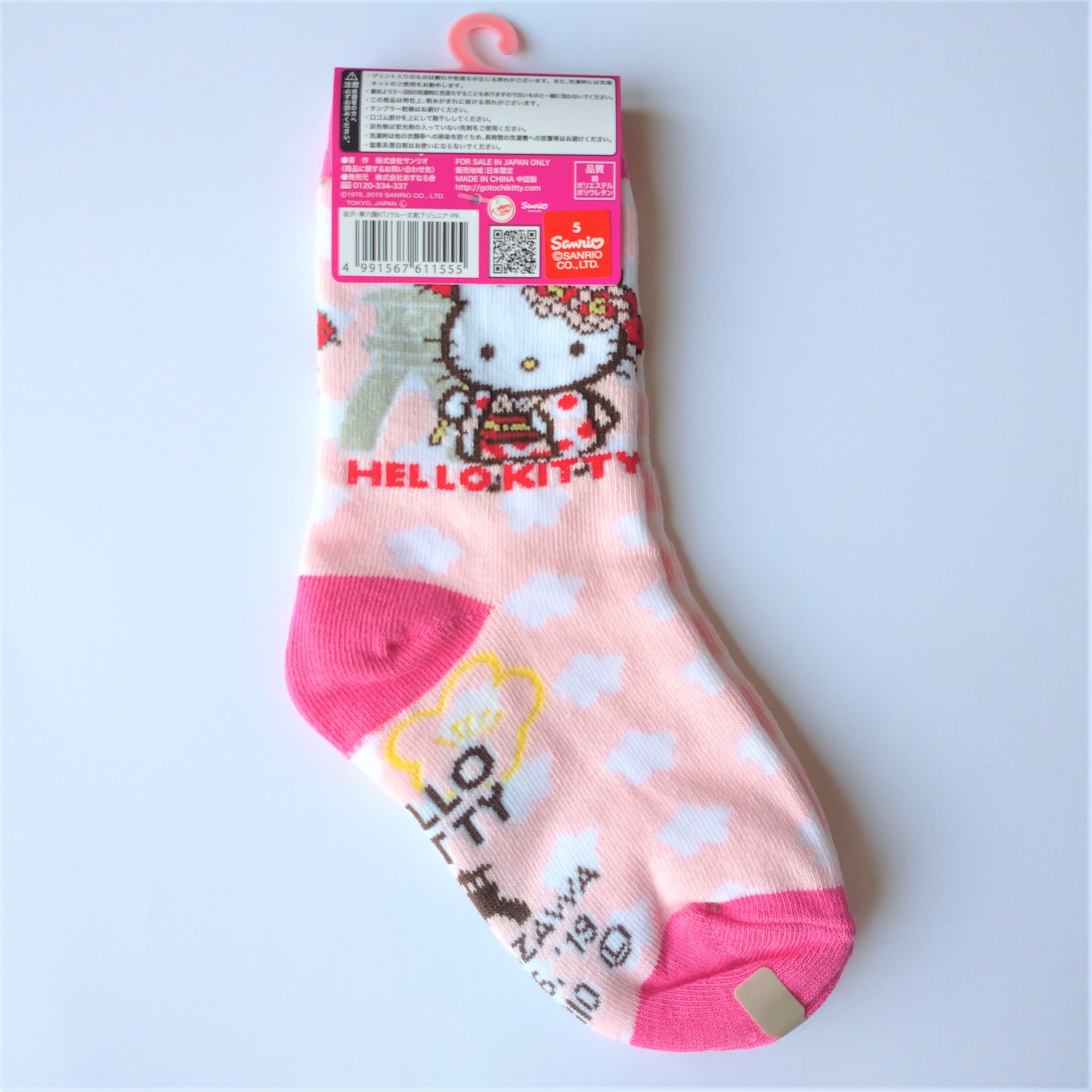 着物を来たキティーと手まりで遊ぶ姿がカワイイ柄のご当地ソックス。クルー丈です。